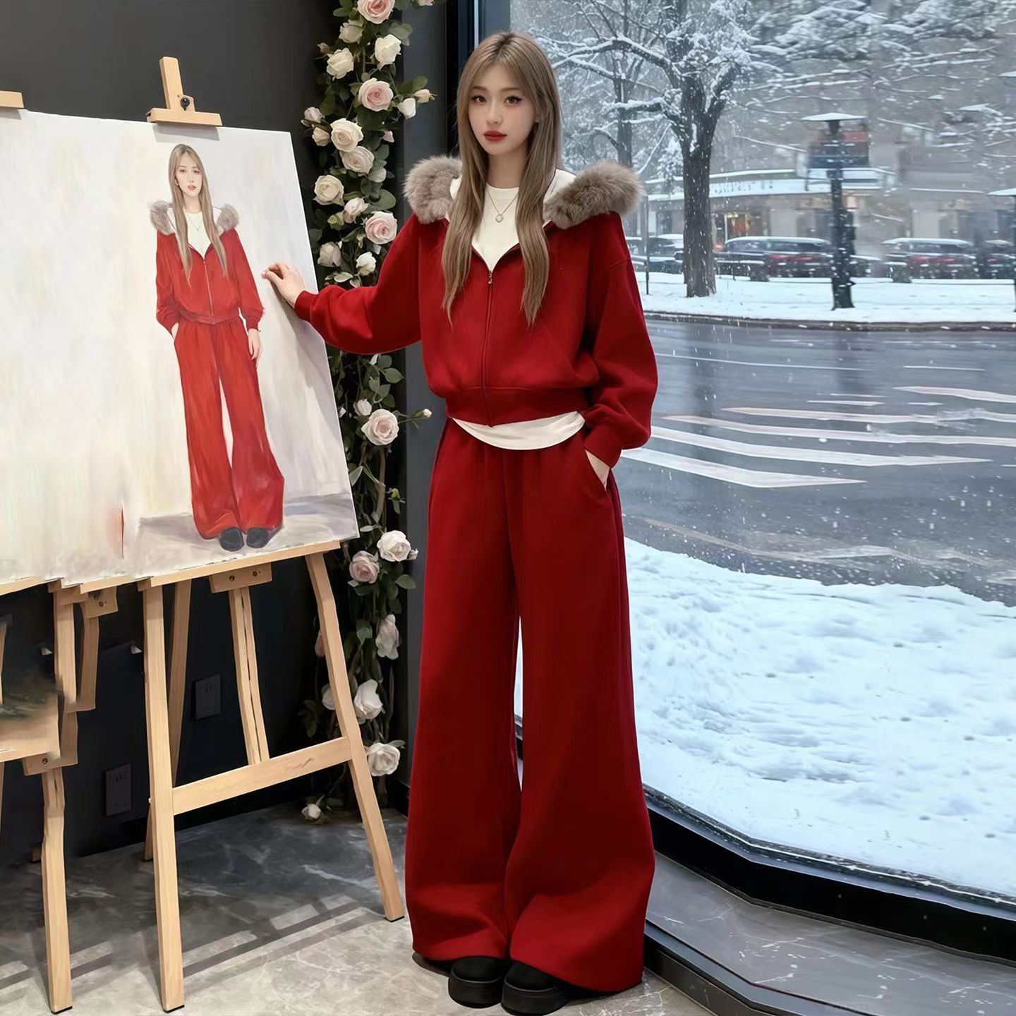 [1]【休閒百搭 新年本命年紅色套裝】加絨大毛領套裝 一入組-NT$1250